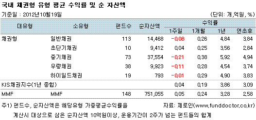 ÇÑ ÁÖ°£ ä±ÇÇüÆÝµå´Â ±Ý¸®º¯È¿¡ µÐ°¨ÇÑ Ãʴܱâä±ÇÆÝµå¸¸ÀÌ 0.04%·Î ¼ÒÀ¯ÇüÁß È¦·Î Ç÷¯½º ¼º°ú¸¦ ±â·ÏÇß´Ù. ä±Ç¾à¼¼¿¡ º¸À¯Ã¤±ÇÀÇ µà·¹À̼ÇÀÌ ±ä Áß±âä±ÇÆÝµå°¡ -0.21%·Î °¡Àå ºÎÁøÇß´Ù. ¿ì·®Ã¤±ÇÆÝµå´Â -0.11%, ÀϹÝä±ÇÆÝµå´Â -0.08%¸¦ ±â·ÏÇß´Ù.