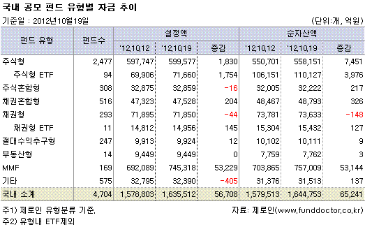 19ÀÏ ÇöÀç, Á¦·ÎÀÎ À¯ÇüºÐ·ù±âÁØÀ¸·Î ÆÝµåÀÚ±Ý µ¿ÇâÀ» Á¶»çÇÑ °á°ú ÇÑ ÁÖ°£ ¼³Á¤¾×ÀÌ 5Á¶ 6,708¾ï¿ø Áõ°¡Çß´Ù. ÀÌ Áß mmfÀÇ ¼³Á¤¾× Áõ°¡¾×ÀÌ 5Á¶3,229¾ï¿øÀ¸·Î ±¹³» °ø¸ðÆÝµå Àüü ¼³Á¤¾× Áõ°¡¸¦ À̲ø¾ú´Ù.