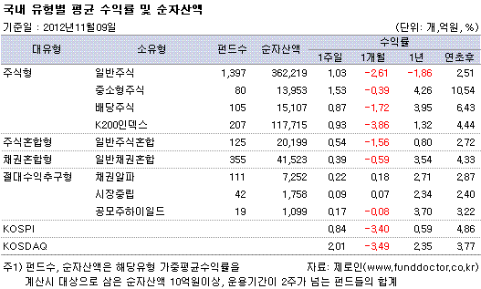 ÆÝµåÆò°¡»ç Á¦·ÎÀÎ(www.funddoctor.co.kr)ÀÌ 9ÀÏ ¾ÆÄ§ °ø½ÃµÈ ±âÁذ¡°ÝÀ¸·Î ÆÝµå ¼öÀÍ·üÀ» Á¶»çÇÑ °á°ú ±¹³»ÁÖ½ÄÇüÆÝµå(Å׸¶, ±âŸÀ妽º Á¦¿Ü)´Â ÇÑ ÁÖ°£ 1.04% »ó½ÂÇß´Ù. ÄÚ½ºÇÇÁö¼ö´Â ÇÑÁÖ°£ 0.84% »ó½ÂÇß´Ù. ´ëÇüÁÖÁö¼ö¿Í ÁßÇüÁÖÁö¼ö´Â °¢°¢ 0.89%,0.43% »ó½ÂÇßÀ¸¸ç, ¼ÒÇüÁÖÁö¼ö´Â 1.14% ¿Ã¶ú´Ù. ÄÚ½º´ÚÁö¼ö´Â 2.01% »ó½ÂÀ¸·Î ¼±ÀüÇß´Ù.