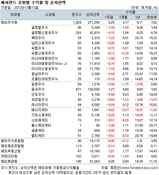 ÆÝµåÆò°¡»ç Á¦·ÎÀÎ(www.funddoctor.co.kr)ÀÌ 12ÀÏ ¾ÆÄ§ °ø½ÃµÈ ±âÁذ¡°ÝÀ¸·Î ÆÝµå¼öÀÍ·üÀ» Á¶»çÇÑ °á°ú, ÇØ¿ÜÁÖ½ÄÇüÆÝµå´Â ÇÑ ÁÖ°£ 0.25%ÀÇ ¼öÀÍ·üÀ» ±â·ÏÇß´Ù. imf°¡ ¼¼°è °æÁ¦¼ºÀå Àü¸ÁÀ» ÇÏÇâÁ¶Á¤ÇÑ ÀÌÈÄ ±Û·Î¹ú °æ±â µÐÈ ¿ì·Á°¨ÀÌ È®»êµÆ´Ù. ¶ÇÇÑ À¯·ÎÁ¸ ºÒÈ®½Ç¼ºÀÌ ¿©ÀüÈ÷ ½ÃÀå½É¸®¸¦ Áþ´·¶´Ù. Áß±¹ÁÖ½ÄÆÝµå´Â °æ±âºÎ¾çÃ¥ ±â´ë°¨ÀÌ È£Àç·Î ÀÛ¿ëÇÏ¸é¼ È¦·Î »ó½ÂÇß´Ù.